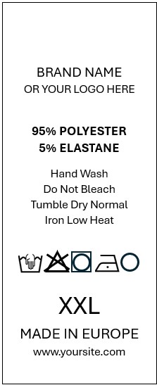 - Vaskeanvisning (valgfri): Producenter behøver ikke at bruge de standardiserede vaskesymboler (GINETEX). De skal dog give en vejledning i, hvordan tøjet skal vedligeholdes, men dette kan i princippet gøres med tekst i stedet for ikoner.